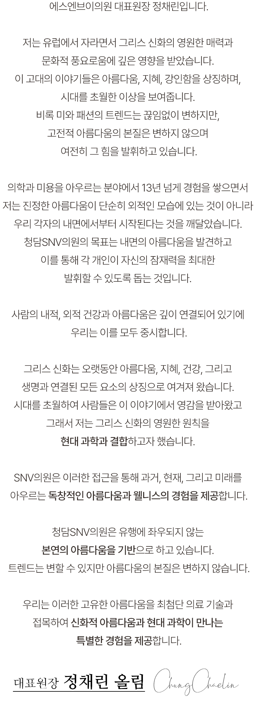 ![]() 안녕하세요 SNV클리닉의원 원장 정채린입니다. 저는 유럽에서 자라면서 저는 그리스 신화의 영원한 매력과 문화적 풍요로움에 깊은 영향을 받았습니다. 이 고대의 이야기들은 아름다움, 지혜, 강인함을 상징하며 시대를 초월한 이상을 보여줍니다. 비록 미와 패션의 트렌드는 끊임없이 변하지만 고전적 아름다움의 본질은 변하지 않으며 여전히 그 힘을 발휘하고 있습니다. 의학과 미용을 아우르는 분야에서 14년 넘게 경험을 쌓으면서 저는 진정한 아름다움이 단순히 외적인 모습에 있는 것이 아니라 우리 각자의 내면에서부터 시작된다는 것을 깨달았습니다. 청담SNV의원의 목표는 내면의 아름다움을 발견하고 이를 통해 각 개인이 자신의 잠재력을 최대한 발휘할 수 있도록 돕는 것입니다. 사람의 내적, 외적 건강과 아름다움은 깊이 연결되어 있기에 우리는 이를 모두 중시합니다. 그리스 신화는 오랫동안 아름다움, 지혜, 건강, 그리고 생명과 연결된 모든 요소의 상징으로 여겨져 왔습니다. 시대를 초월하여 사람들은 이 이야기에서 영감을 받아왔고 그래서 저는 그리스 신화의 영원한 원칙을 현대 과학과 결합하고자 했습니다. SNV의원은 이러한 접근을 통해 과거, 현재, 그리고 미래를 아우르는 독창적인 아름다움과 웰니스의 경험을 제공합니다. 청담SNV의원은 유행에 좌우되지 않는 본연의 아름다움을 기반으로 하고 있습니다. 트렌드는 변할 수 있지만 아름다움의 본질은 변하지 않습니다. 우리는 이러한 고유한 아름다움을 최첨단 의료 기술과 접목하여 신화적 아름다움과 현대 과학이 만나는 특별한 경험을 제공합니다. 대표원장 정채린 올림 |
